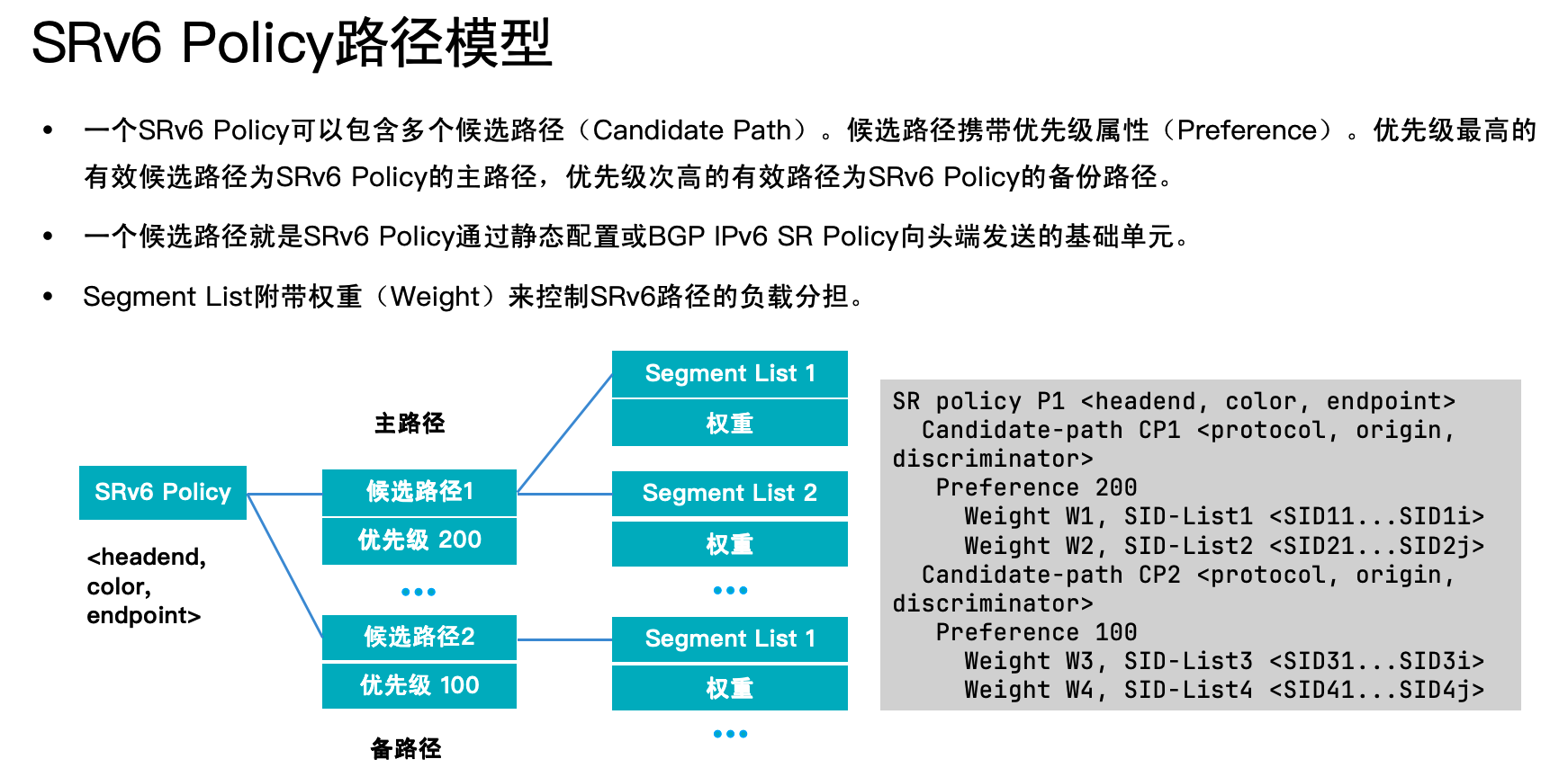 一个SRv6 Policy可以包含多个候选路径(Candidate Path)。候选路径携带优先级属性(Preference)。优先级最高的有效候选路径为SRv6 Policy的主路径,优先级次高的有效路径为SRv6 Policy的备份路径。Segment List附带权重(Weight)来控制SRv6路径的负载分担
